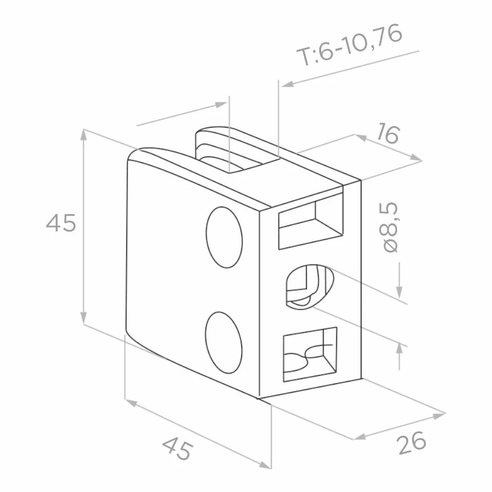 Rechteckiger Glashalter 45×45×26 mm zur Befestigung von Glasscheiben mit einer Stärke von 6 bis 10,76 mm auf ebenen Flächen. Gefertigt aus Edelstahl AISI 304 mit Satin-Finish — ideal für innenliegende Glasgeländer, Trennwände und Verkleidungen, bei denen Ästhetik und Verbindungsstabilität entscheidend sind.