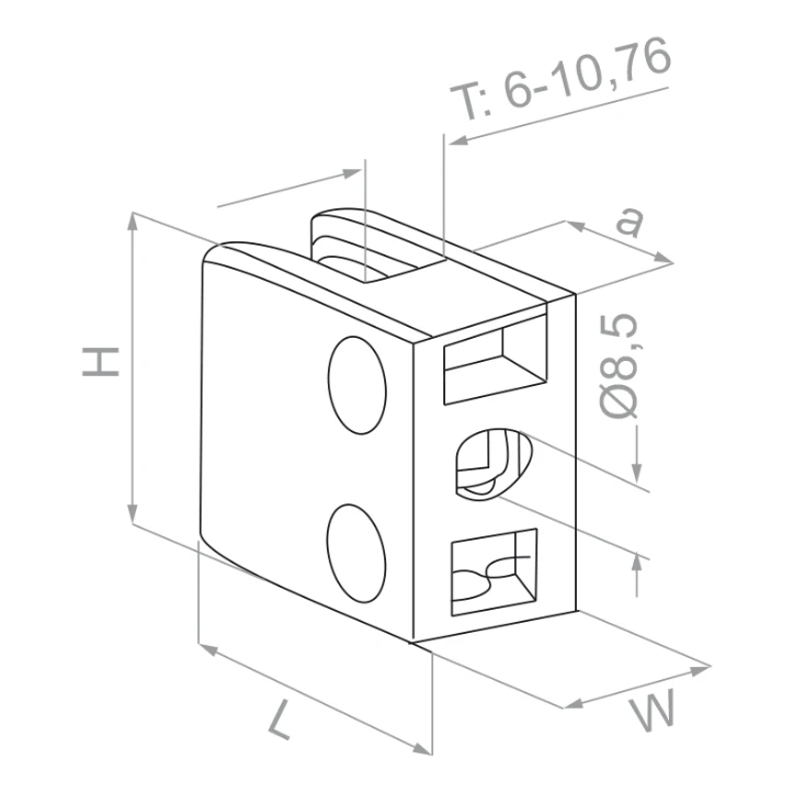 Rechteckiger Glashalter aus Edelstahl AISI 316 mit Satinoberfläche, konzipiert für die Montage auf ebenen Flächen. Die kompakte Konstruktion mit den Abmessungen 45 × 45 × 26 mm ermöglicht eine sichere Befestigung von Glasscheiben mit einer Stärke von 6 bis 10,76 mm – sowohl für Einscheibensicherheitsglas als auch für Verbundglas.