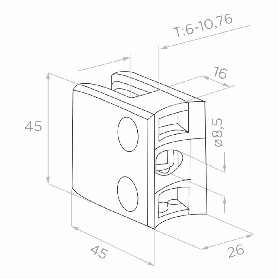 Rechteckiger Glashalter 45×45×26 mm aus Edelstahl AISI 304 in Satin-Finish. Geeignet zur Befestigung von Glasscheiben mit einer Stärke von 6–10,76 mm an Rohrpfosten mit einem Durchmesser von 48,3 mm. Das Produkt wird eingeschraubt montiert und gewährleistet eine stabile und ästhetische Befestigung von Glasplatten in Geländern und Trennwänden.