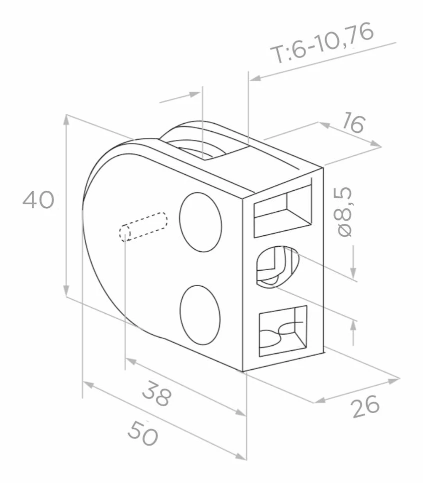 Der Halter eignet sich überall dort, wo eine Glasscheibe auf einer ebenen Stahl- oder Aluminiumfläche befestigt werden muss – in Innen- und Außengeländern, Bürotrennwänden, Treppenabdeckungen sowie Terrassenverglasungen. Die Kompatibilität mit Glas der Dicke 6–10,76 mm umfasst sowohl monolithisches Einscheibensicherheitsglas als auch Verbundglas (z. B. 2×5 mm mit PVB-Folie 0,76 mm), was dem Installateur große Flexibilität bei der Wahl der Verglasung bietet.
