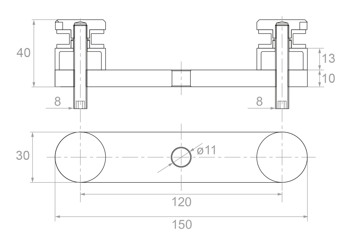 Die universelle Konstruktion ermöglicht die Anwendung mit Scheiben verschiedener Dicke – von gehärtetem Glas 8 mm bis zu Verbundglas 21,52 mm. Das Gewinde M8 in beiden Bolzen des Halters gewährleistet zuverlässige Befestigung und einfache Montage mit handelsüblichen Schrauben.