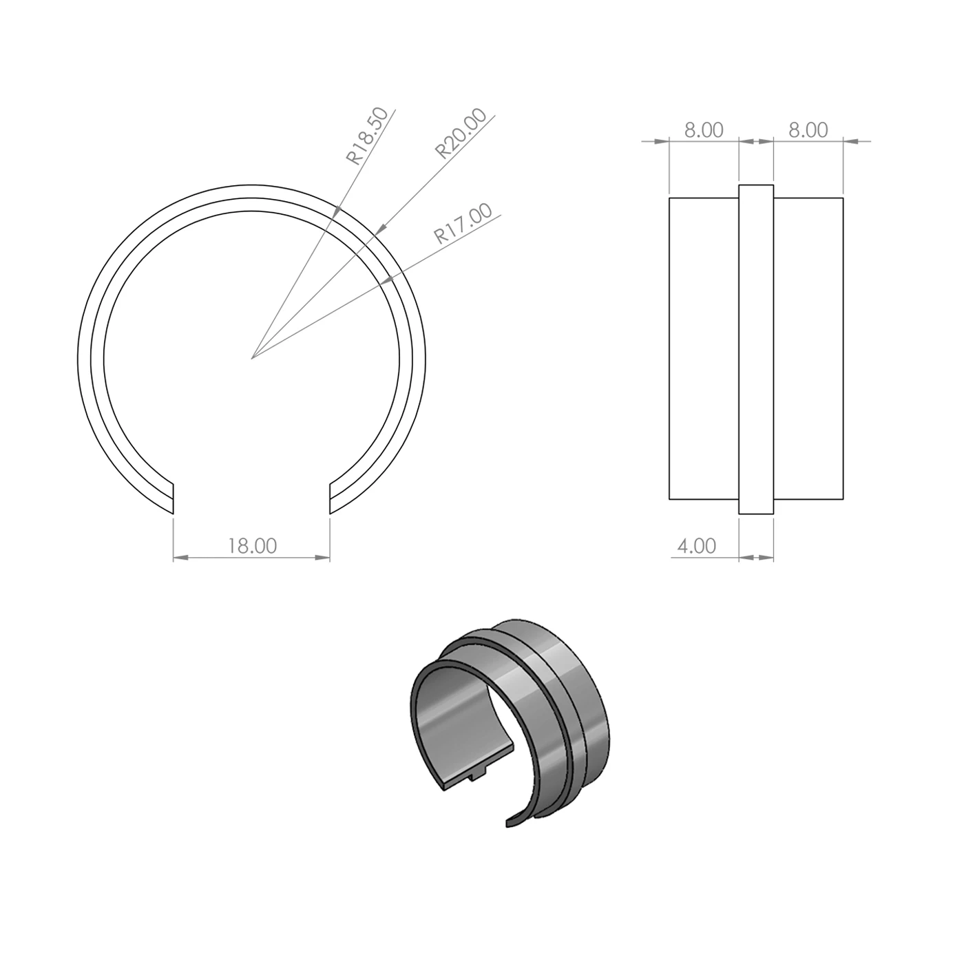 Die Radiendifferenz R18,50 und R17,00 bildet eine Stufung, die für die stabile Befestigung des Handlaufs verantwortlich ist – das Element fügt sich präzise ohne Spiel ein. Der zentrale Bund mit Radius R20,00 mm und Dicke 4 mm dient als Anschlag und hält den Koppler in konstanter Position an der Scheibenkante. Die symmetrischen Einschiebsegmente von je 8 mm auf jeder Seite gewährleisten eine gleichmäßige Abstützung des Handlaufs und ein professionelles Aussehen der fertigen Balustrade.