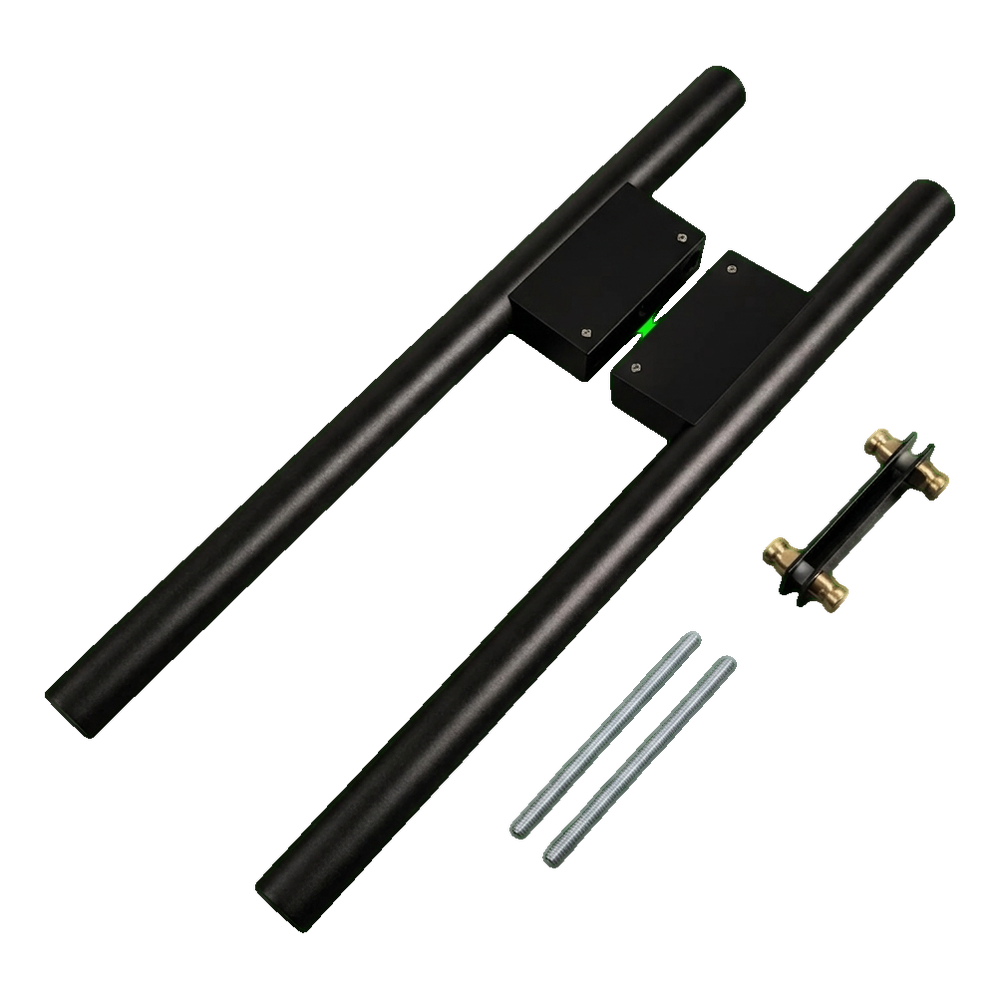 Die aus Aluminium gefertigte Halterung verfügt über präzise gefräste Durchgangsbohrungen für M8-Gewindespindeln. Die Verbindung der beiden Halterungshälften gewährleistet eine steife und stabile Befestigung an der Tür. Die gesamte Konstruktion ist mit einer einheitlichen schwarzen matten Beschichtung versehen, die Stahl- und Aluminiumelemente visuell harmonisch zu einem stimmigen Ganzen verbindet.