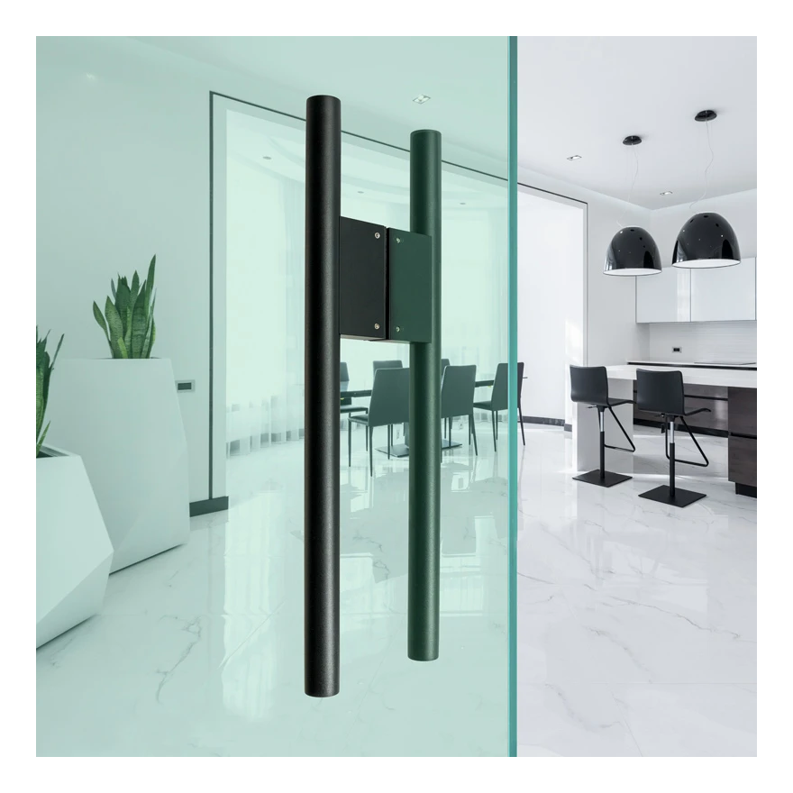 Zweiseitiger Türgriff PSG in der Farbe schwarz matt ist eine elegante und ergonomische Lösung für Ganzglastüren, Holz- und Metalltüren. Vollständig aus hochwertigem Edelstahl AISI 304 gefertigt und mit einer langlebigen matten Beschichtung versehen, garantiert er ein ästhetisches Erscheinungsbild und Widerstandsfähigkeit gegen den täglichen Gebrauch in gewerblichen und Bürogebäuden.