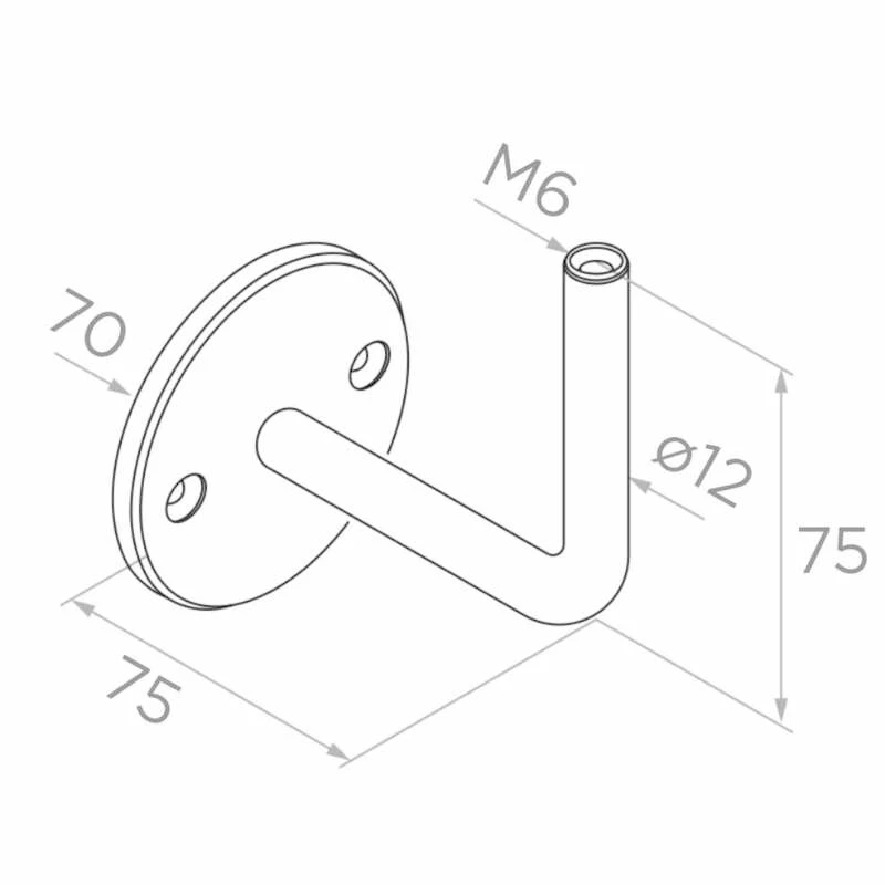 Die Halterung besitzt keine Montageplatte — der Handlauf verbindet sich mit dem Arm über ein M6-Gewinde. Dies ist eine universelle Konstruktion, die sich sowohl im Wohnungsbau als auch in öffentlichen Gebäuden bewährt.