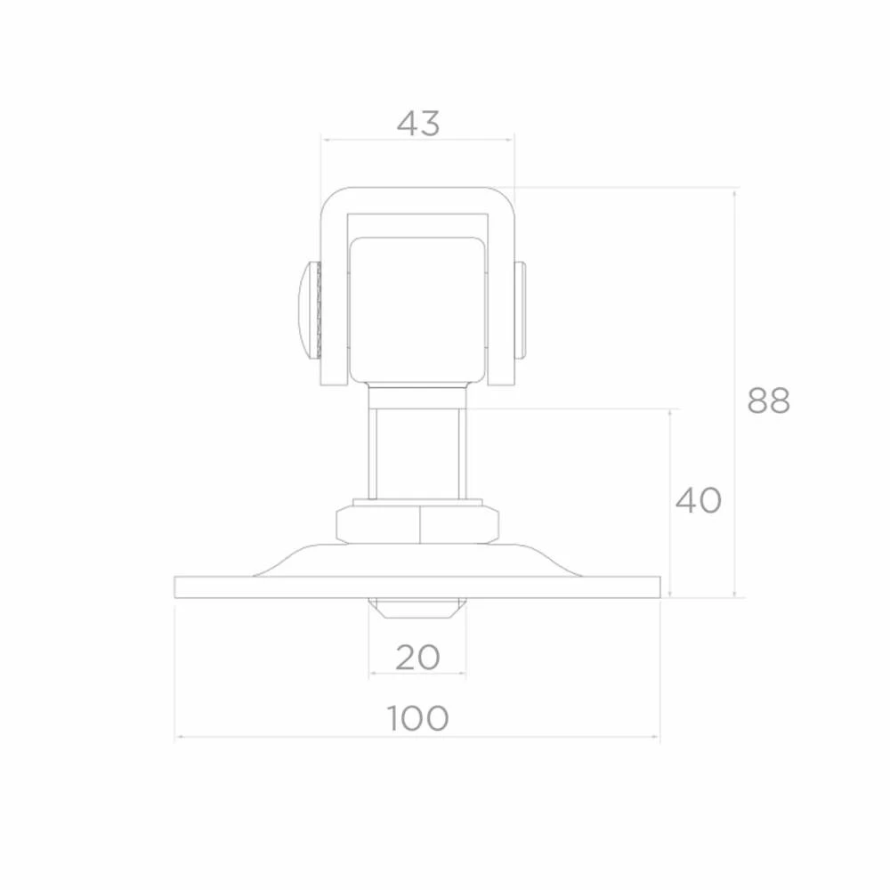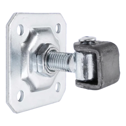 Das Scharnier ist für die Montage an Pfosten von Flügeltoren bestimmt — aus Stahl, gemauert oder aus Beton. Vier Montagelöcher in der Platte (Ø 10,5 mm) ermöglichen eine sichere Verschraubung am Untergrund mit entsprechenden Schrauben oder Ankern. Nach der Befestigung der Platte am Pfosten und des Auges am Torflügel genügt es, die Reguliermutter am M20 Gewinde anzuziehen, um die gewünschte Flügelposition einzustellen. Die Regulierung kann beliebig oft wiederholt werden — dies ist besonders nützlich im Winter, wenn sich Metall bei niedrigen Temperaturen zusammenzieht, und im Sommer, wenn es sich thermisch ausdehnt.