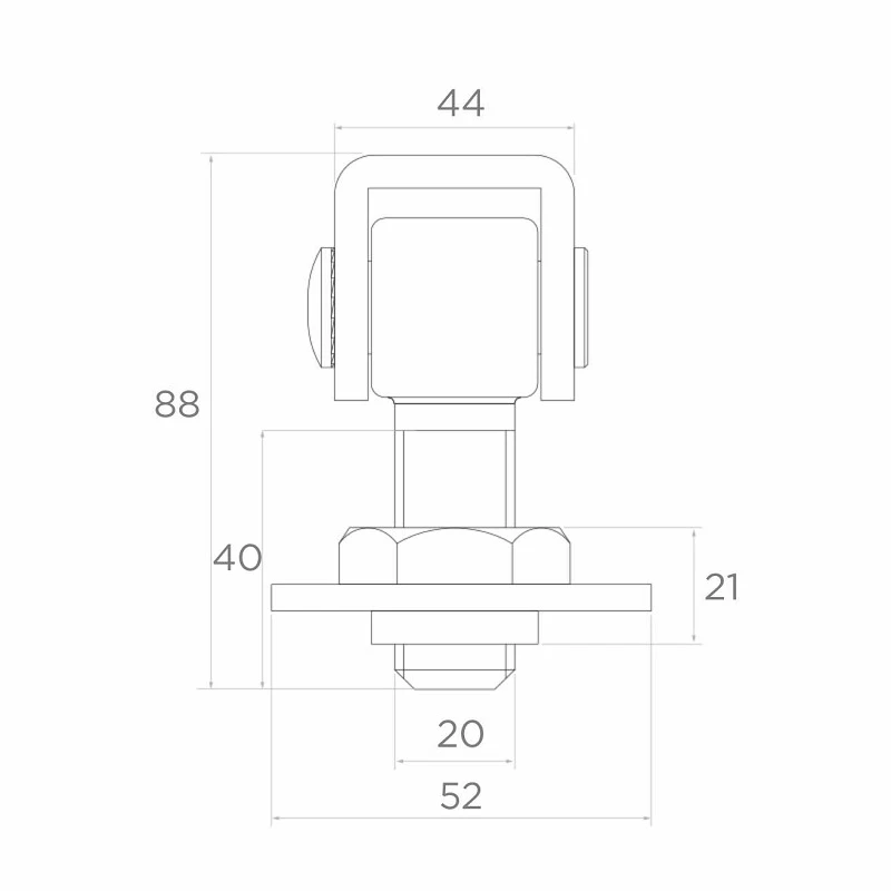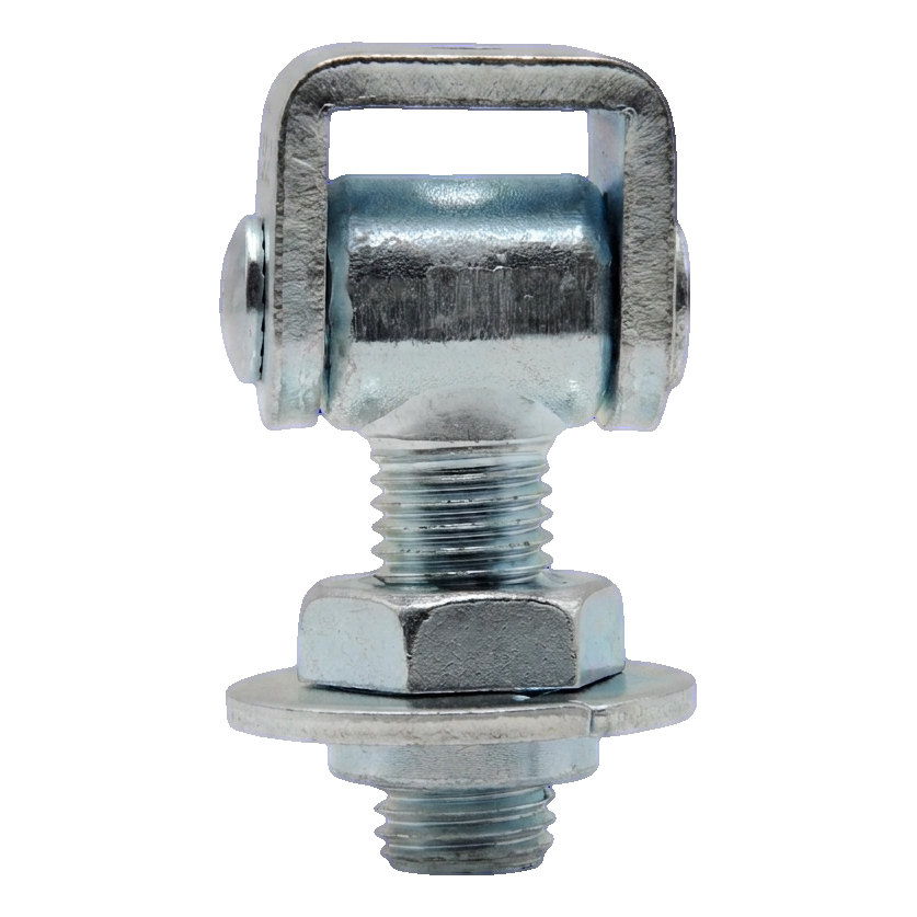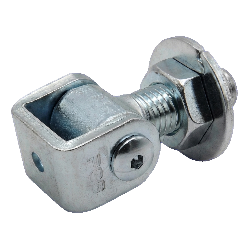 Das Scharnier besteht aus einer Lasche mit Drehachse sowie einem Gewindebolzen M20 mit Stellmutter und Unterlegscheibe. Die Montage erfolgt durch Anschweißen des Bolzens an den Zaunpfosten, was eine stabile und dauerhafte Befestigung gewährleistet und das Risiko des Lockerns während des Betriebs eliminiert. Ein Scharnierpaar trägt Lasten bis zu 105 kg bei einem Flügel von 2 m Länge, wodurch sie sowohl für leichte Pforten als auch für schwere Industrietore geeignet sind.