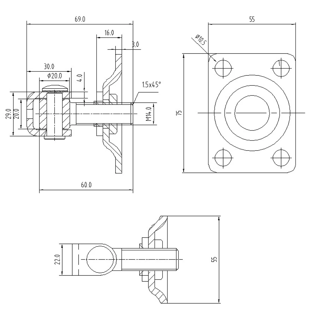 - Durchmesser der Befestigungsbohrungen: ⌀10,5 mm