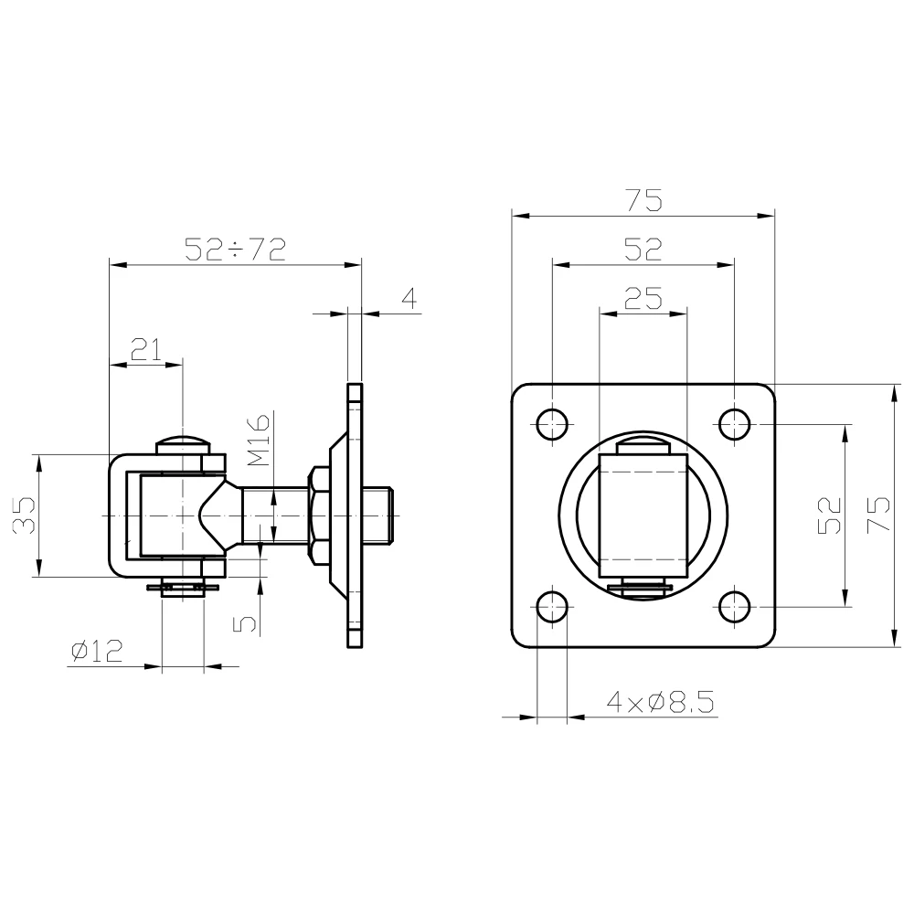 Die Montageplatte mit den Abmessungen 75×75 mm mit vier Befestigungslöchern gewährleistet eine stabile und gleichmäßige Lastübertragung auf den Pfosten. Der Verstellbereich 52–72 mm ermöglicht eine flexible Anpassung des Bandrücksprungs an verschiedene Profil- und Pfostenstärken, was die Arbeit der Montageteams auf der Baustelle erheblich erleichtert.