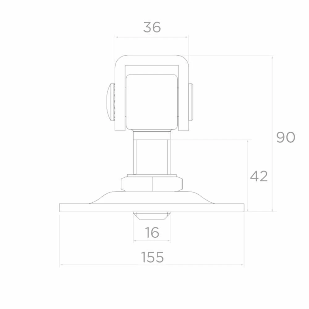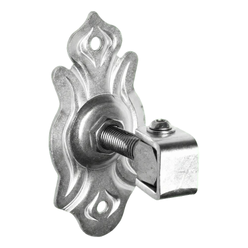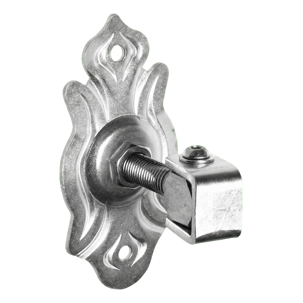 Verstellbares Stahl-Torband mit Zierblech für die Montage an Toren und Pforten. Die M16-Schraube mit Einstellmutter ermöglicht eine präzise Korrektur der Torflügelstellung zu jedem Zeitpunkt — sowohl direkt nach der Montage als auch während des Betriebs, z.B. wenn aufgrund niedriger Temperaturen oder Durchhängung der Konstruktion eine Nachjustierung erforderlich ist.
