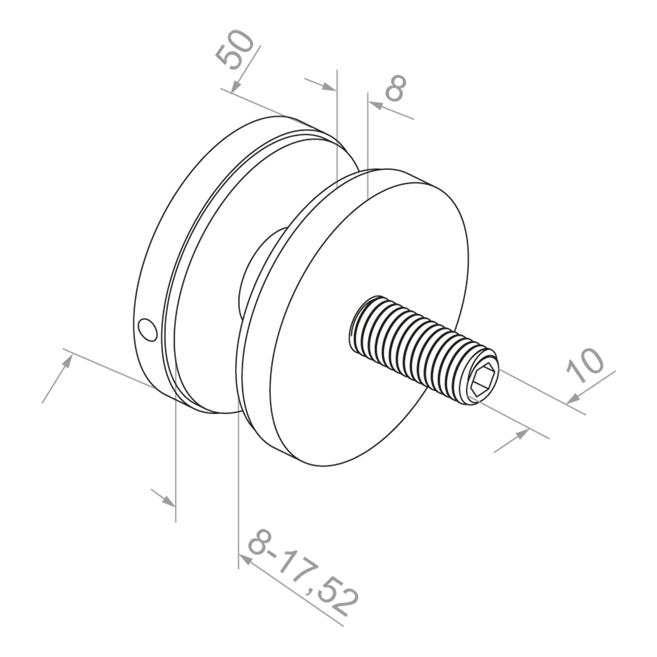 Die Konstruktion des Halters besteht aus einem zylindrischen Korpus mit Druckelement sowie einem Gewindebolzen M10×50, der eine solide und sichere Befestigung im Untergrund gewährleistet. Die Montageöffnung mit einem Durchmesser von 18 mm erleichtert die präzise Positionierung. Der Halter unterstützt Glas mit einer Dicke von 8 bis 17,52 mm, was vielseitige Anwendungsmöglichkeiten bietet – von einzelnen Scheiben bis hin zu mehrschichtigem Verbundglas.