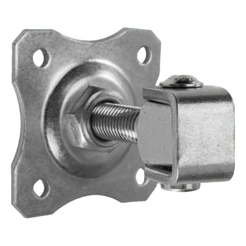 Stahl-Regulierscharnier mit Zierplatte M20 für die Montage von Torflügeln und Gartenpforten. Dank M20-Gewinde mit Einstellmutter ermöglicht es die präzise Einstellung des Torflügels zu jedem Zeitpunkt — sowohl bei der ersten Montage als auch während des Betriebs, z.B. bei Durchhängen der Konstruktion oder thermischen Verformungen des Metalls im Winter.