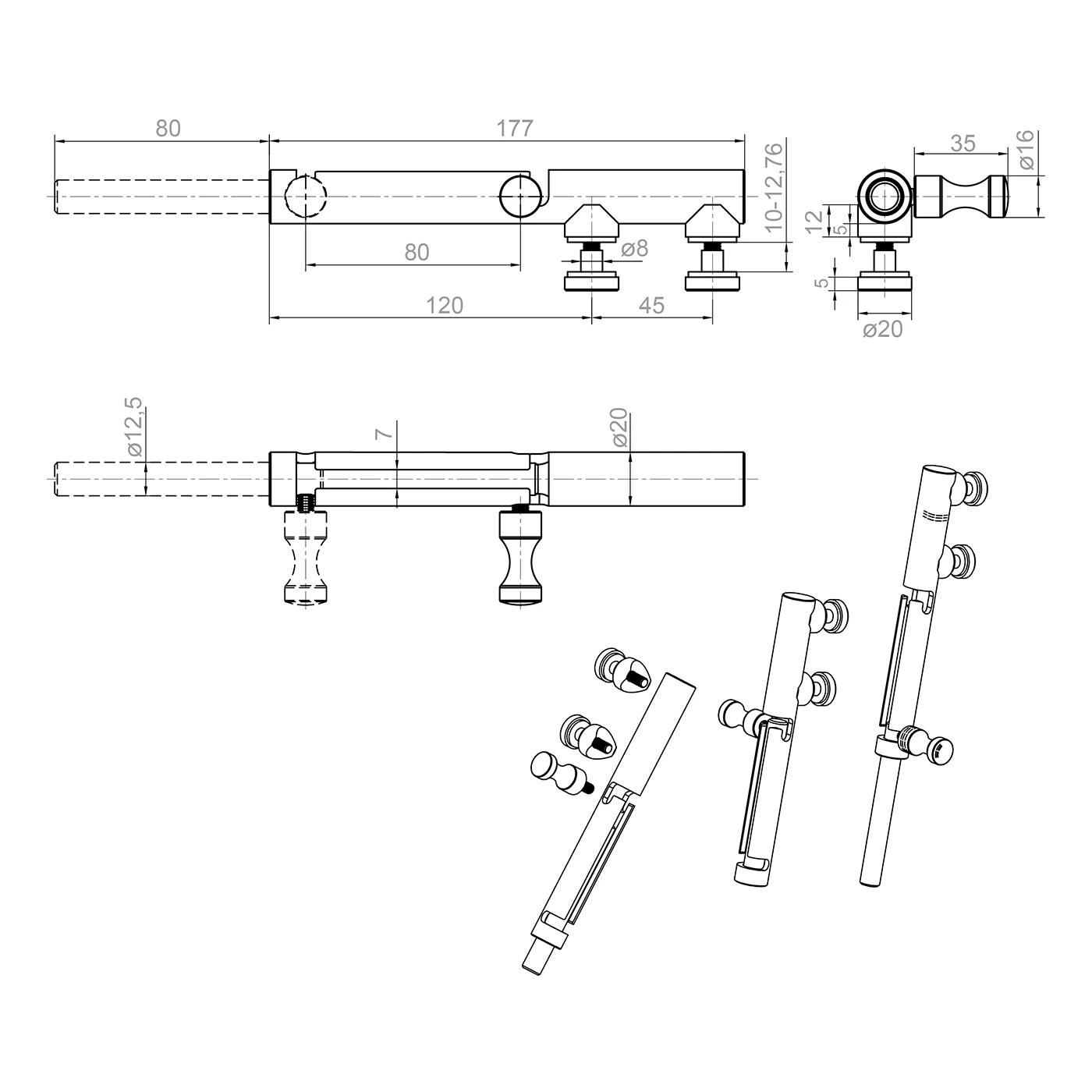 Die technische Zeichnung zeigt die kompletten Abmessungen des Riegels samt Montagedetails. Der Verriegelungsbolzen mit Durchmesser ø12,5 mm fährt 80 mm weit aus dem Gehäuse aus und gewährleistet eine sichere Blockierung der Tür. Der Bediengriff mit Durchmesser ø16 mm und Länge 35 mm ermöglicht eine bequeme einhändige Bedienung. Zwei Befestigungspunkte mit Achsabstand 45 mm und dekorativen Kappen ø20 mm garantieren eine stabile, ästhetische Verankerung in der Glasscheibe.