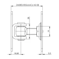 Jede Montageplatte verfügt über zwei Löcher Ø7 mm mit einem Abstand von 56 mm, was die Anpassung an typische Zaunpfosten erleichtert. Das Scharnier wird im montierten Zustand geliefert — es genügt, es an der Konstruktion zu befestigen und den Flügelabstand über das M12-Gewinde zu justieren.