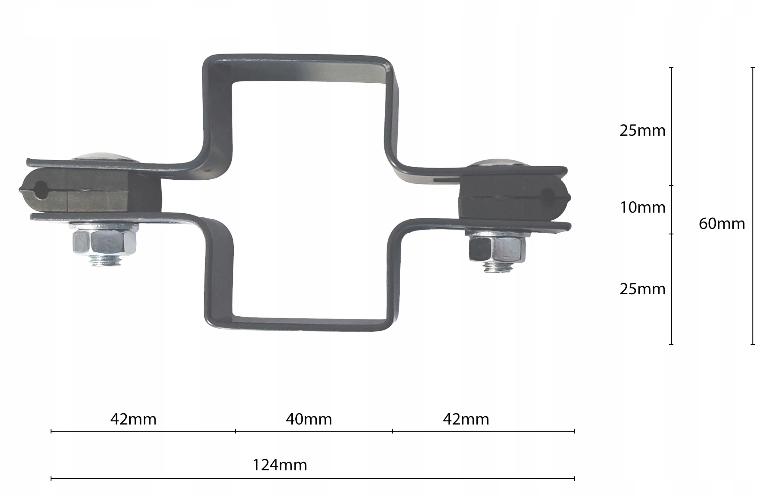 Die Zwischenschelle 40x60 mm ist ein zuverlässiges Konstruktionselement zur Montage von Zaunpaneelen an Pfosten mit einem Querschnitt von 40x60 mm.